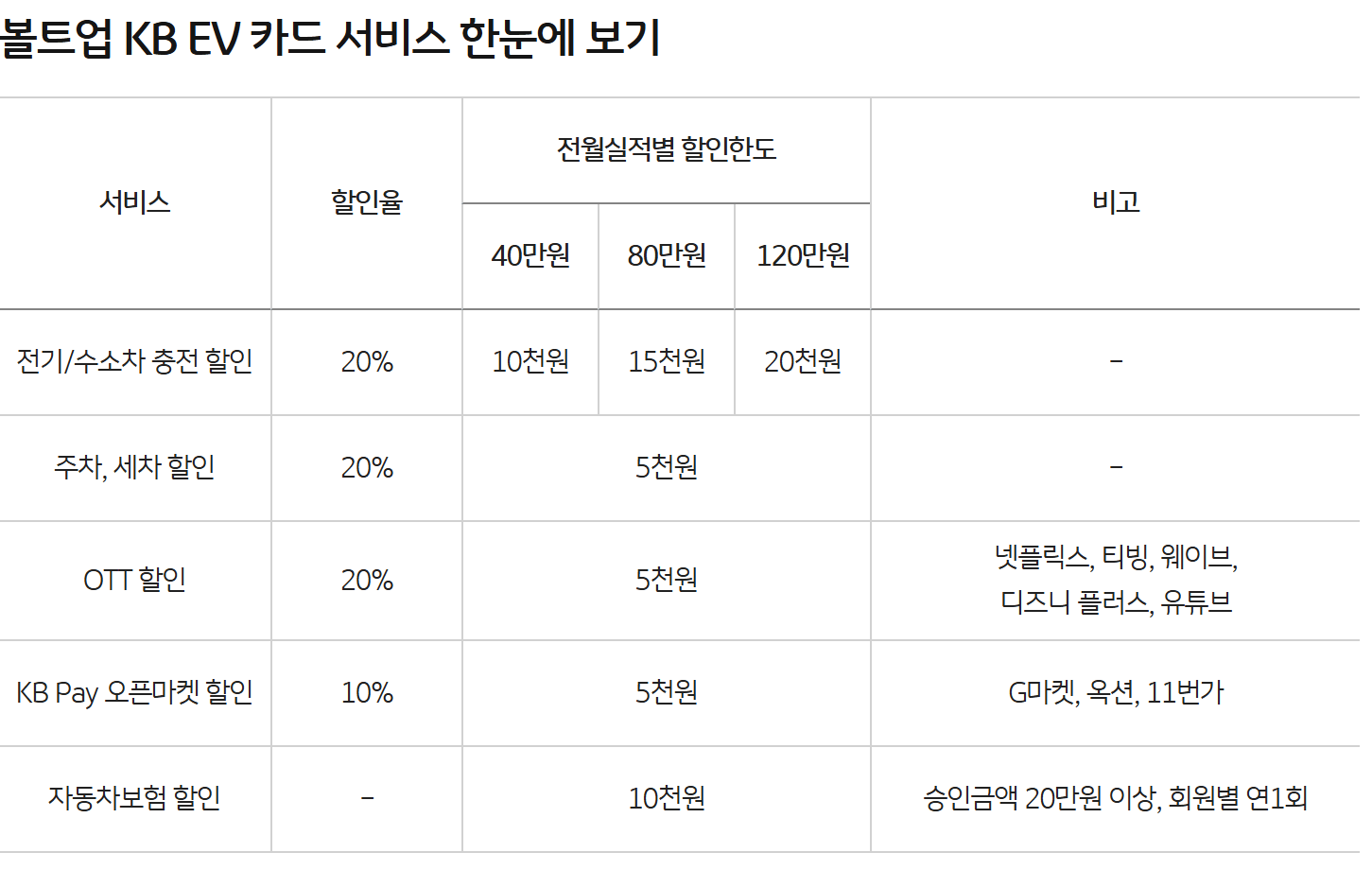볼트업 KB EV 카드의 주요 혜택은 크게 차량 관련 서비스와 생활 편의 서비스로 나뉩니다.