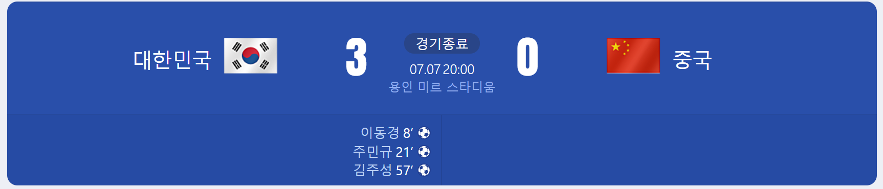새로운 전술적 시도는 결과로 증명됐다. 전반 이동경(김천)과 주민규(대전)가 연속으로 골망을 흔들었고, 후반 김주성(서울)이 추가골을 넣으며 3-0 완승을 이뤄냈다. 특히 수비적 안정감이 돋보였다. 중국의 공격을 확실하게 차단하며 무실점 승리의 토대를 마련했다.