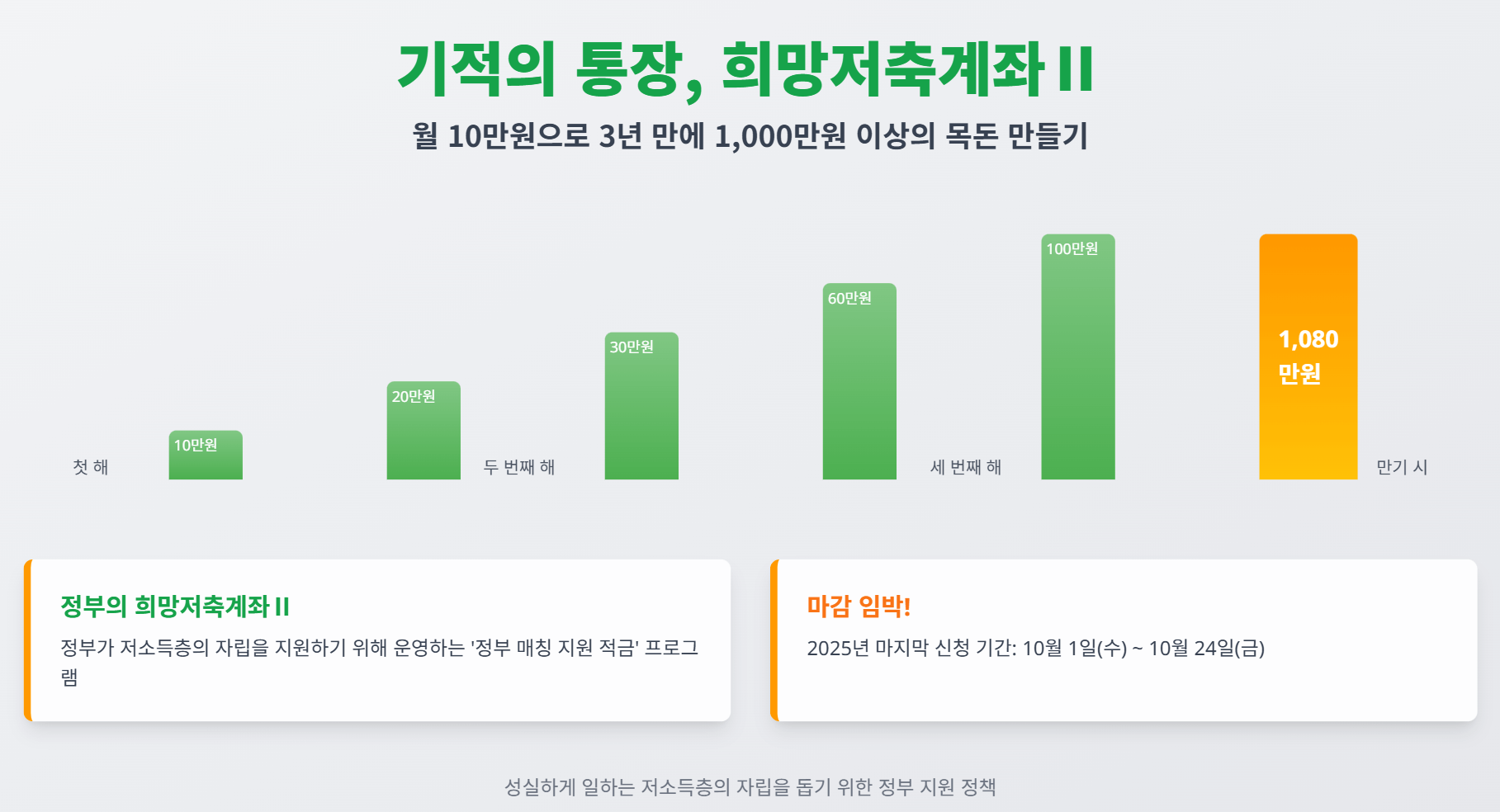 안녕하세요! "월 10만원씩 3년을 모았을 뿐인데, 통장에 1,000만 원이 넘는 목돈이 생긴다면?" 꿈같은 이야기 같지만, 실제로 가능한 정부 지원 정책이 있습니다. 바로 '희망저축계좌Ⅱ'인데요.