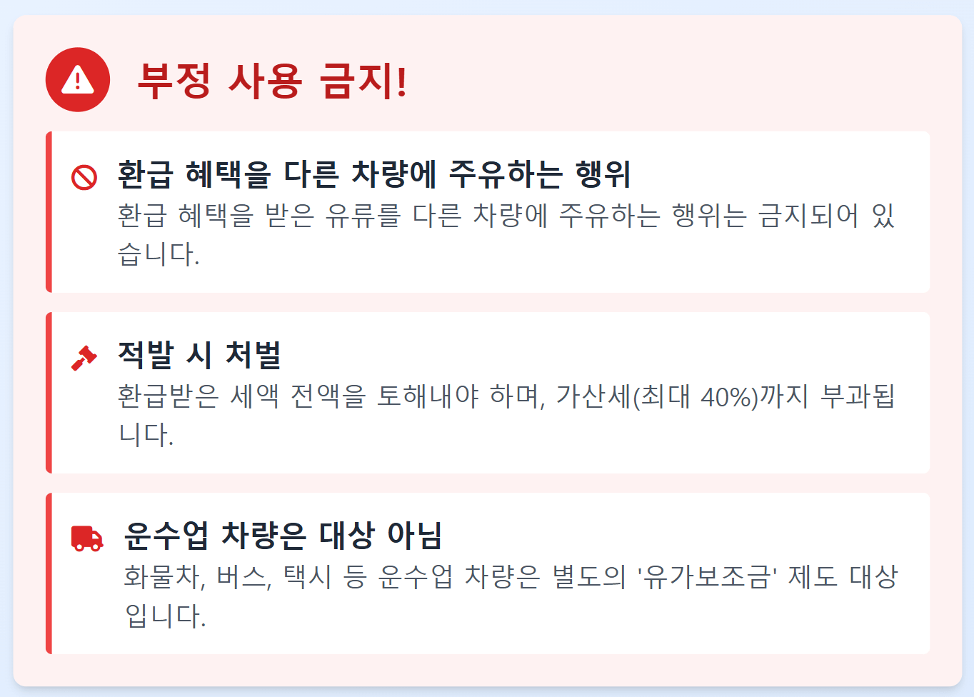 - 환급 혜택을 받은 유류를 해당 경차가 아닌 다른 차량에 주유하는 행위 (예: 가족의 다른 차에 넣어주는 것)