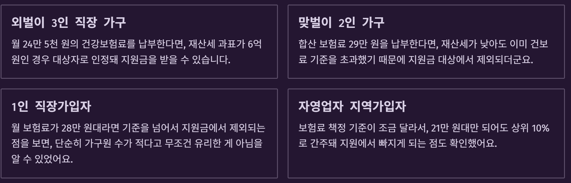 ※ 추가 제외 기준 건강보험료 기준을 통과했더라도, 재산세 과세표준 9억 원 초과 또는 금융소득(이자, 배당) 연 2천만 원 초과 시에는 자동으로 상위 10%로 분류되어 지원에서 제외될 수 있습니다.